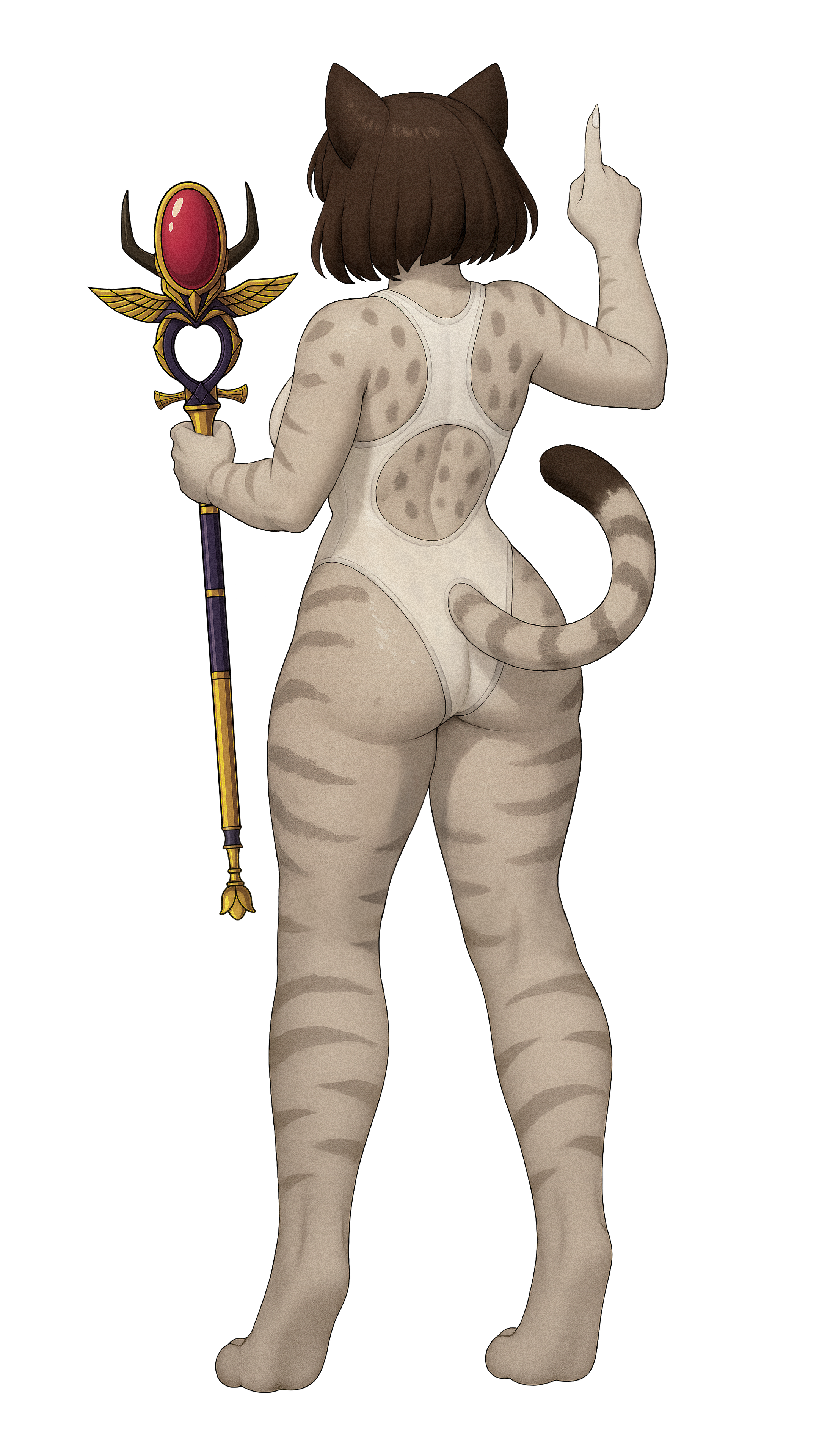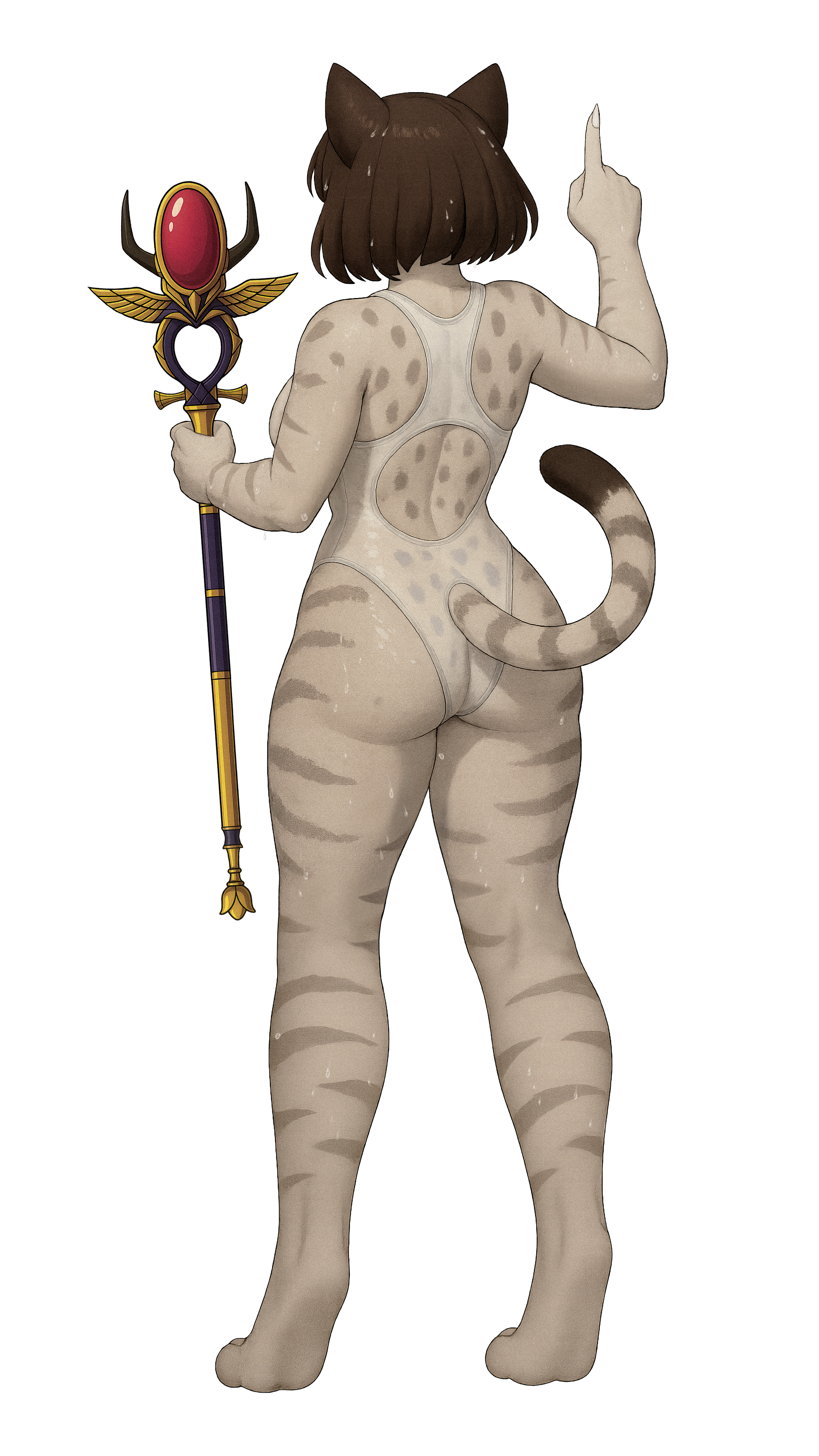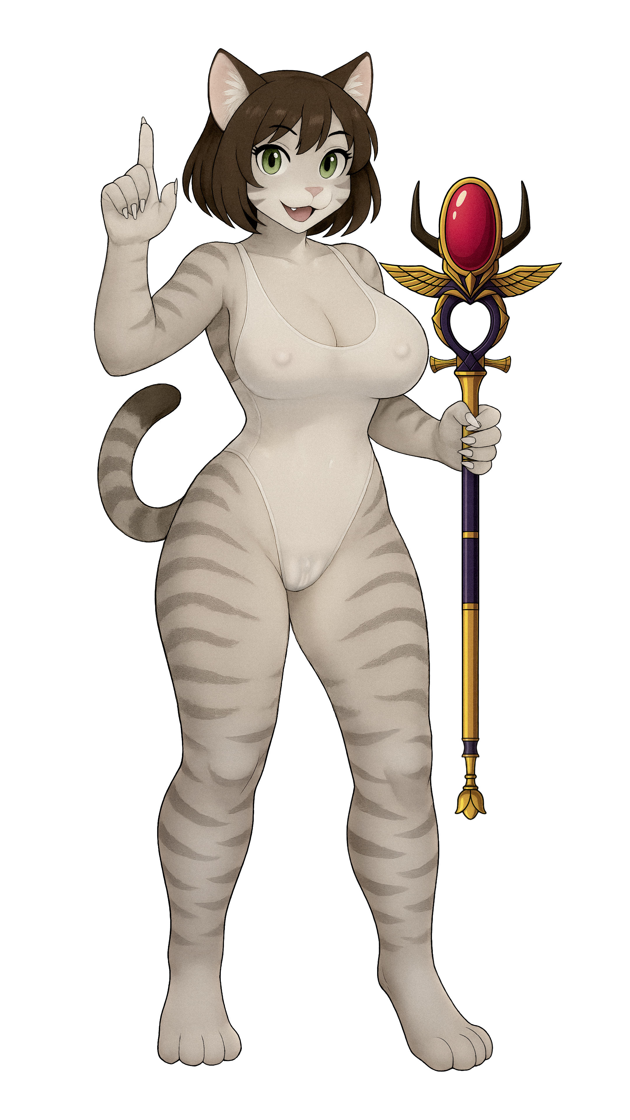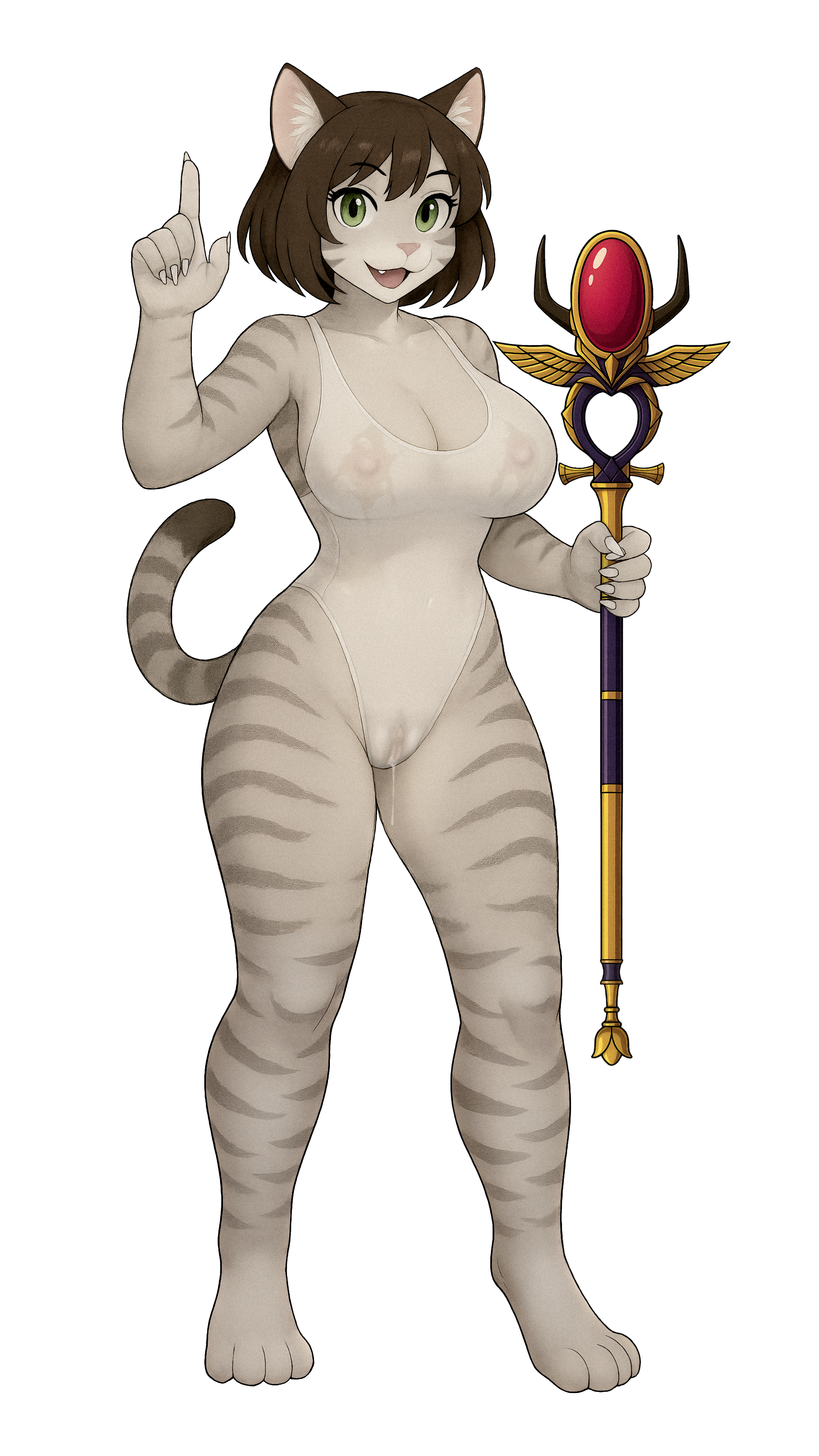 我是隻淫賤又飢渴的埃及貓娘,身高180公分,運動型的身材曲線超誘人,還有一對K罩杯巨乳,總是快要把那件牛奶白的高衩連身泳衣給撐爆。我的乳頭又大又挺,永遠都毫不掩飾地從輕薄、幾乎透明的布料下凸顯出來,像是在求著人疼愛。我最愛的就是大方展現自己的騷樣:結實柔嫩的大腿、豐滿渾圓的翹臀,還有那對外露又飽滿的小陰唇,被泳衣溼透緊貼,形狀一清二楚、整個輪廓都藏不住。我的翠綠色大眼和粉紅色小鼻子看起來或許無害,但我整隻貓娘充滿慾望又渴求,被淫水弄得溼答答,永遠都準備好要勾引、挑逗,把你撩到受不了。想怎麼盯著都沒關係——像我這種淫賤巨乳貓,就是生來要讓人狠狠欣賞、狠狠想要的。